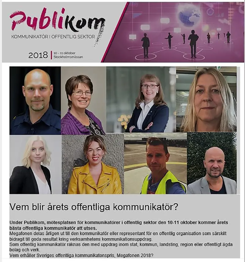 Priset Megafonen 2018 delas ut på Publikom, en branschmässa för kommunikatörer inom offentlig sektor. Priset delas årligen ut till den kommunikatör eller representant för en offentlig organisation som särskilt bidragit till goda resultat kring verksamhetens kommunikationsuppdrag. Särskild hänsyn tas till nyskapande kommunikation som givit goda resultat och gott ledarskap inom ramen för uppdraget. Priset delas ut den 10 oktober i klassen Årets kommunikatör i offentliga sektorn.