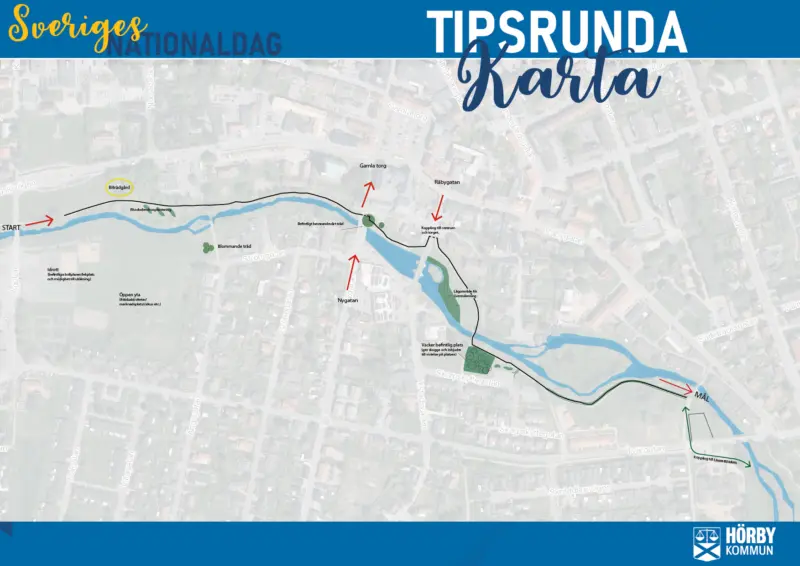 Nationaldagsfirandet fortsätter med tipsrunda i Sverigetema. Tipsrundan finns i två varianter, en riktad till vuxna och en för barn upp till runt 12 år. Tipsrundan släpps idag kl.10.00 och kommer finnas uppe till och med måndag 8 juni 13.00. Tipsrundan är utformad längst å-promenaden som är cirka 1 km och består av 12 frågor. För att alla ska få möjlighet att delta släpps tipsrundan helt digitalt. På så sätt kan du även välja var du vill gå promenaden.