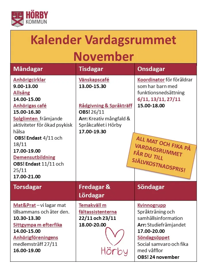 Här nedan ser du kalendarium över aktiviteter för oktober och november månad.